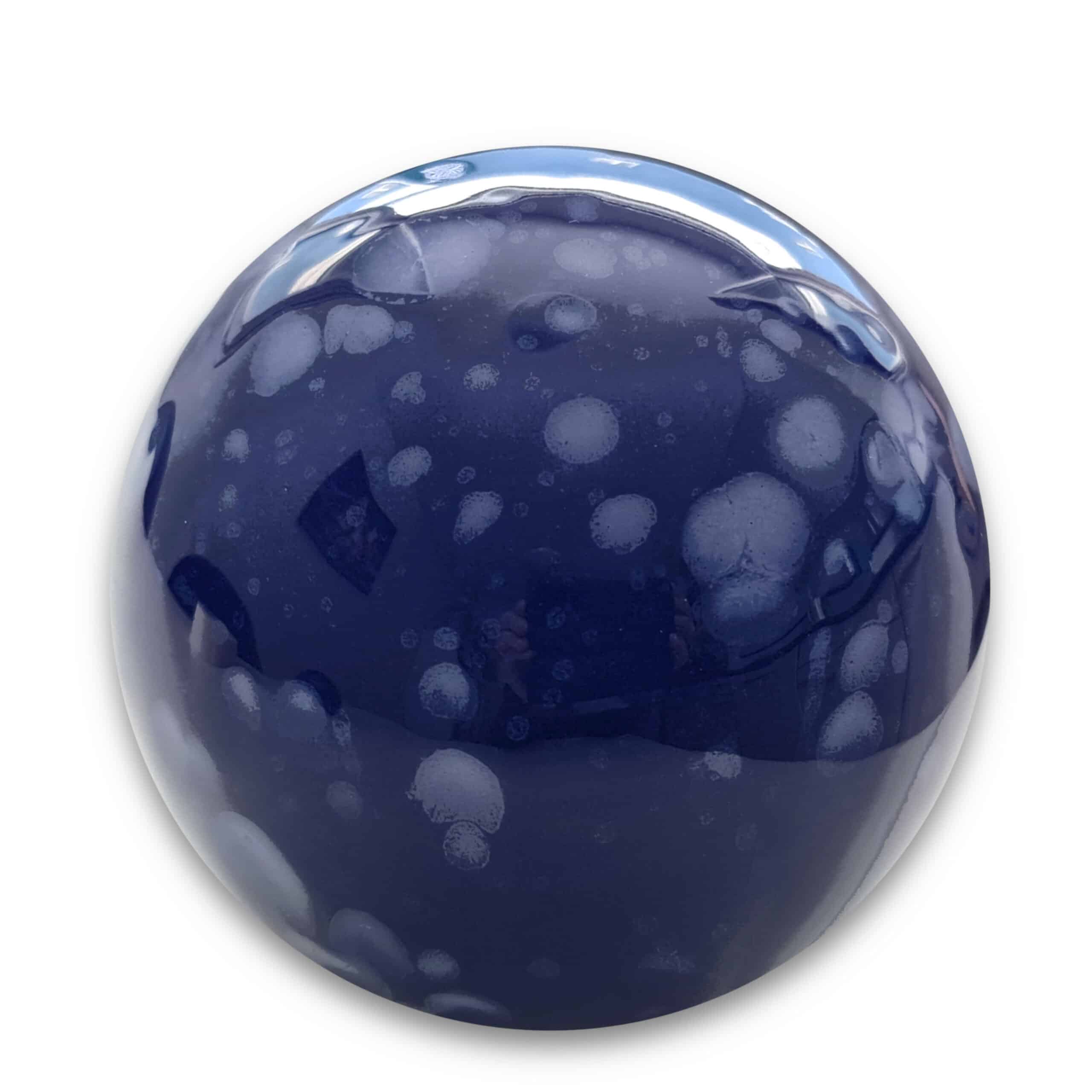 A blue glazed bullet with white splashes of color decorating the surface.
