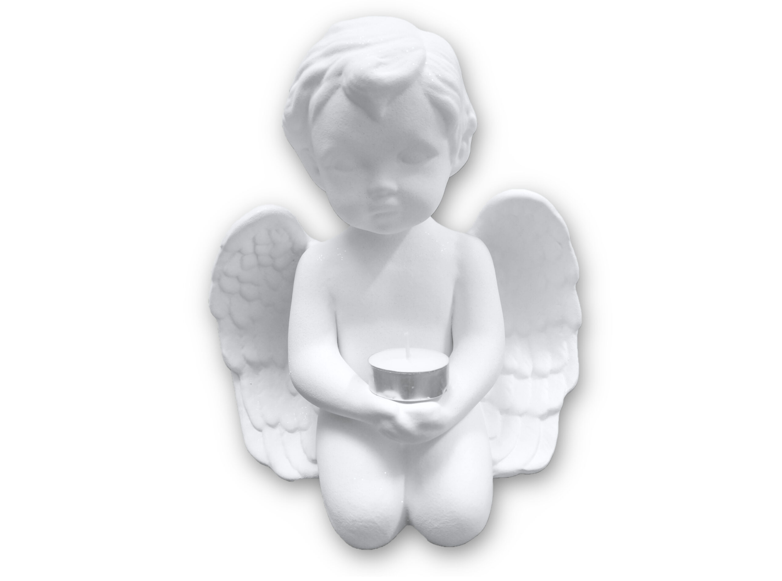 Diese Tierurne in Form eines Engels hält ein Teelicht und ist in hellem Weiss gehalten. Die Oberfläche ist mit Partikel besprüht, die je nach Lichteinfall mehr oder weniger fest schimmern.