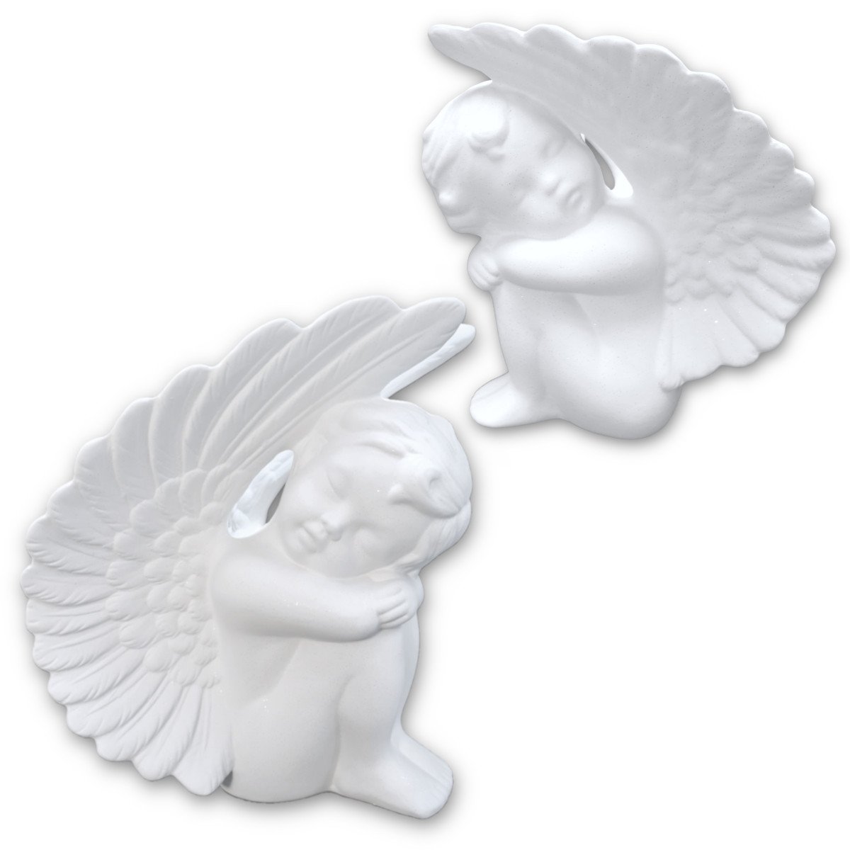 Diese Tierurne in Form eines Engels ist in hellem Weiss gehalten. Die Oberfläche ist mit Partikel besprüht, die je nach Lichteinfall mehr oder weniger fest schimmern.