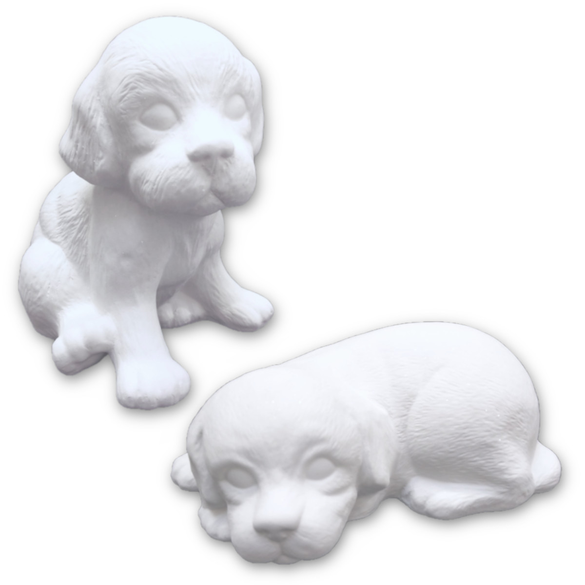 Diese Tierurne in Form eines Hundes ist in hellem Weiss gehalten. Die Oberfläche ist mit Partikel besprüht, die je nach Lichteinfall mehr oder weniger fest schimmern.