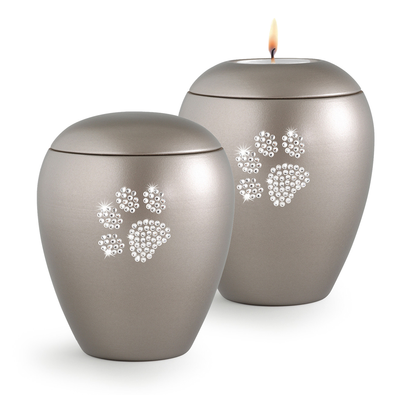 Diese Tierurne aus Keramit besitzt eine perlmuttschillernde Oberfläche. Sie ist verziert mit einer Pfote aus Swarovski-Steinchen, die in Handarbeit aufgebracht werden.