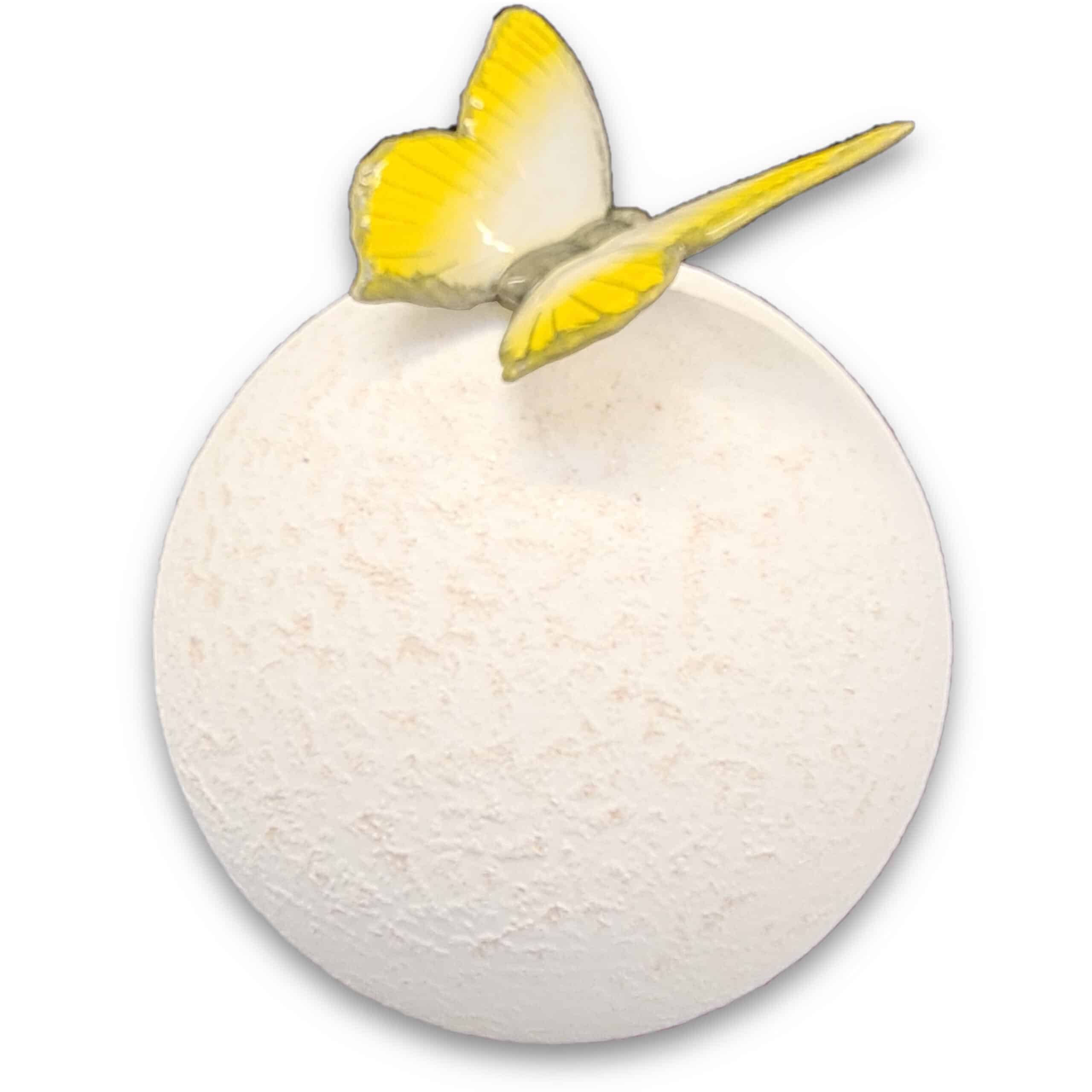 Eine weisse Tierurne mit gelbem Schmetterling. Die Oberfläche ist rau und hat eierschalenfarbige Akzente in der Struktur.
